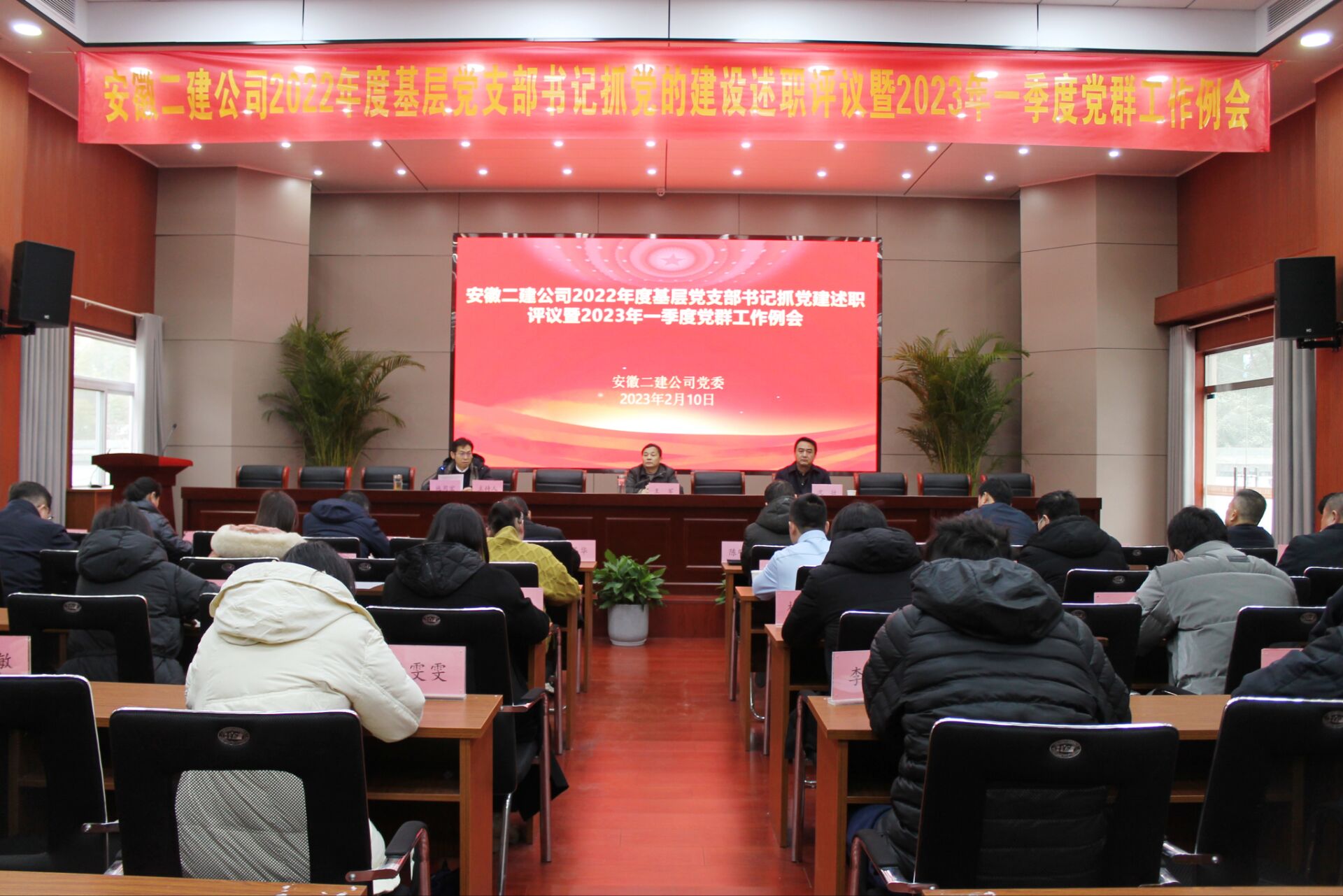 2月10日下午,安徽二建公司在新會議室召開2022年度基層黨支部書記抓黨的建設述職評議暨2023年一季度黨群工作例會。黨委副書記、工會主席王軍,黨委委員、紀委書記沈壯出席會議,黨委工作部主任施用宏主持會議。