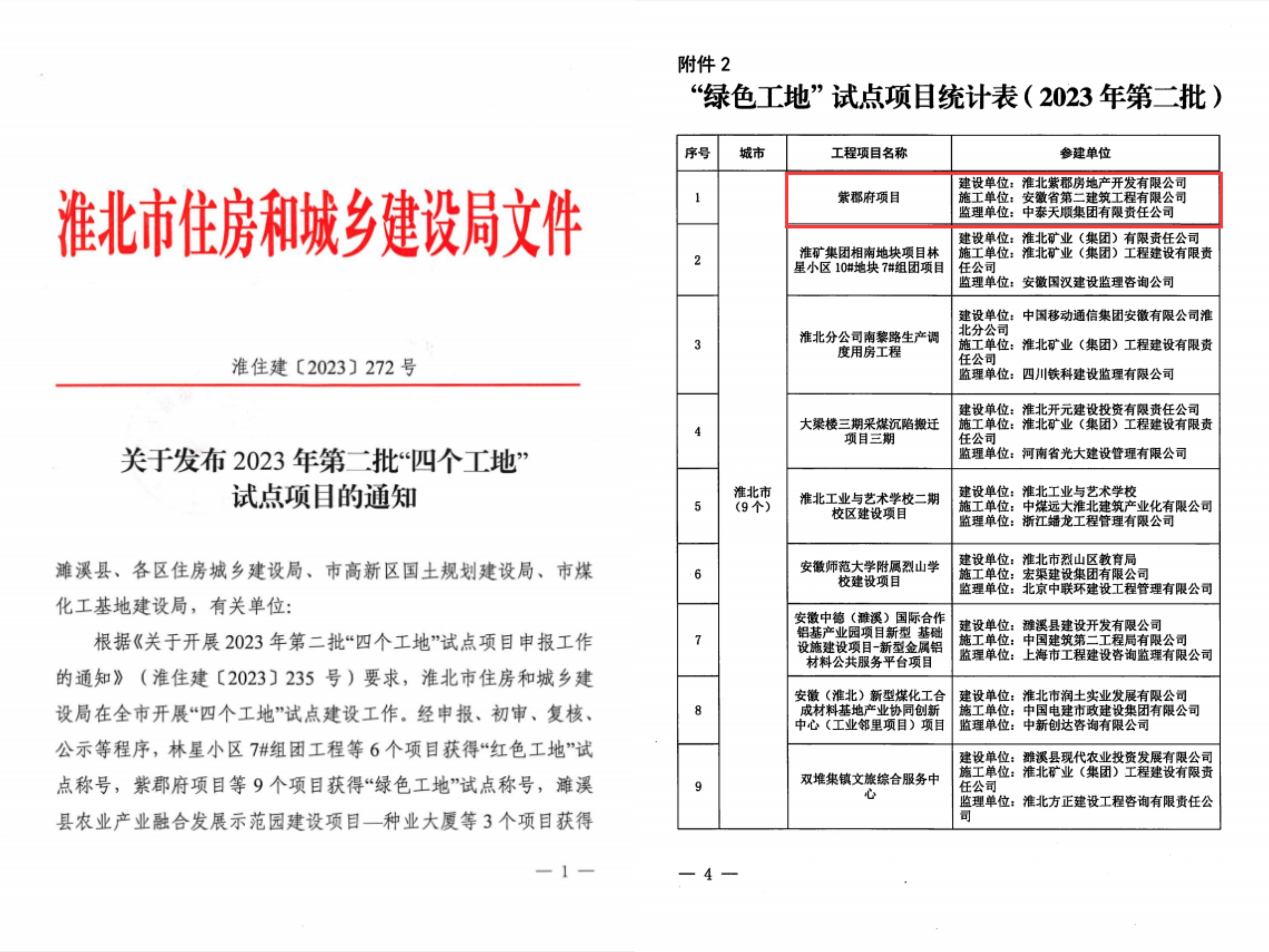近日,淮北市住房和城鄉(xiāng)建設(shè)局發(fā)布了2023年第二批“四個工地”試點項目名單,建工二建第一公司承建的紫郡府項目榮獲淮北市第二批“綠色工地”試點項目稱號。