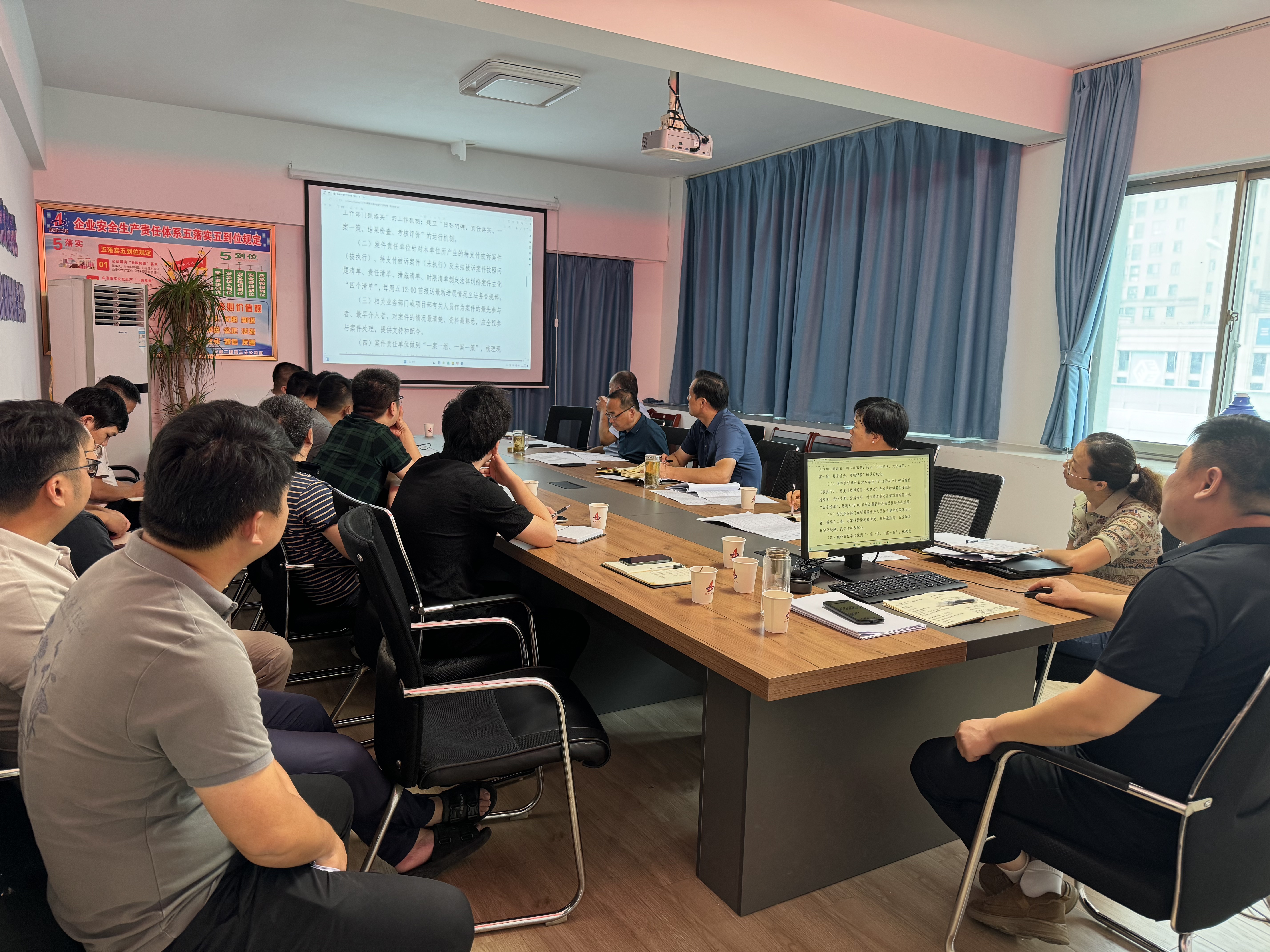 7月27日第三分公司召開法律糾紛案件工作調(diào)度會(huì),分公司班子成員、各項(xiàng)目經(jīng)理、核算人員、債權(quán)回收辦公室工作人員參會(huì)。