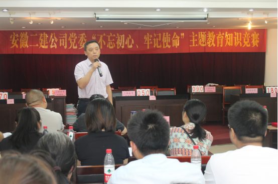 為進(jìn)一步增強(qiáng)“不忘初心、牢記使命”主題教育的參與度,營造良好的學(xué)習(xí)氛圍和群眾基礎(chǔ),做到宣傳教育全覆蓋,9月17日上午,安徽二建公司黨委開展“不忘初心、牢記使命”主題教育知識競賽。所屬黨支部9只隊(duì)伍參加本次知識競賽,公司有關(guān)領(lǐng)導(dǎo)、黨群部門負(fù)責(zé)人、所屬各黨支部書記、團(tuán)支部書記出席活動(dòng)。