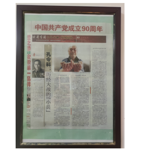 孔令科老人,1926年出生,1941年參軍入伍, 1946年加入中國共產(chǎn)黨,14歲加入新四軍,戎馬生涯中參加過抗日戰(zhàn)爭和解放戰(zhàn)爭,多次立下二等功。在講起那段槍林彈雨、戰(zhàn)火紛飛的革命年代時,他不免有些激動。令我們印象最深的是在戰(zhàn)爭中有五顆手榴彈滾到了他的腳下,幸運的是只有一顆爆炸了,導(dǎo)致右腿右臂受重傷,多處留有彈片。如今95歲高齡的孔老,身體硬朗、思維清晰,始終保持著每天讀書看報的好習(xí)慣,在靜享慢讀中,沉淀出生活的安靜與從容。如今的和平時代是無數(shù)革命先烈用鮮血和生命換來的,沒有他們浴血奮戰(zhàn),何來祖國今日繁榮昌盛?百年征程波瀾壯闊,百年初心歷久彌堅,祖國大地留下的是無數(shù)先輩們奮斗的足跡,流傳著感人肺腑的故事。臨走前,滿頭銀發(fā)的孔老不斷重復(fù)著:“你們生在好時代,大家都年輕,一定要多讀書多學(xué)習(xí)”。