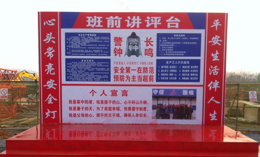 在項(xiàng)目施工現(xiàn)場,坐落著一塊長5米、寬2米的宣傳板,上方寫著“班前講評臺”,左右各寫“心頭常亮安全燈”“平安生活伴人生”的字樣。這是三分公司宿松安建龍溪山莊項(xiàng)目部工地開展的施工前安全教育活動(dòng)。