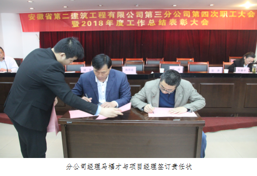 在分公司職工大會(huì)上,分公司經(jīng)理馬福才與參賽的各項(xiàng)目經(jīng)理簽訂了勞動(dòng)競(jìng)賽責(zé)任狀。其中阜陽(yáng)吾悅廣場(chǎng)項(xiàng)目為新城控股開(kāi)發(fā),是分公司首次與上市地產(chǎn)公司合作,工期緊、任務(wù)重,項(xiàng)目經(jīng)理表示一定會(huì)不折不扣的完成勞動(dòng)競(jìng)賽責(zé)任狀的內(nèi)容,做到比、學(xué)、趕、幫、超,塑造二建良好形象。其他項(xiàng)目經(jīng)理也一致表示會(huì)認(rèn)真貫徹職代會(huì)精神,積極響應(yīng)勞動(dòng)競(jìng)賽號(hào)召,為完成公司年度指標(biāo)添磚加瓦,為黨的98歲華誕送上一份生日祝福。