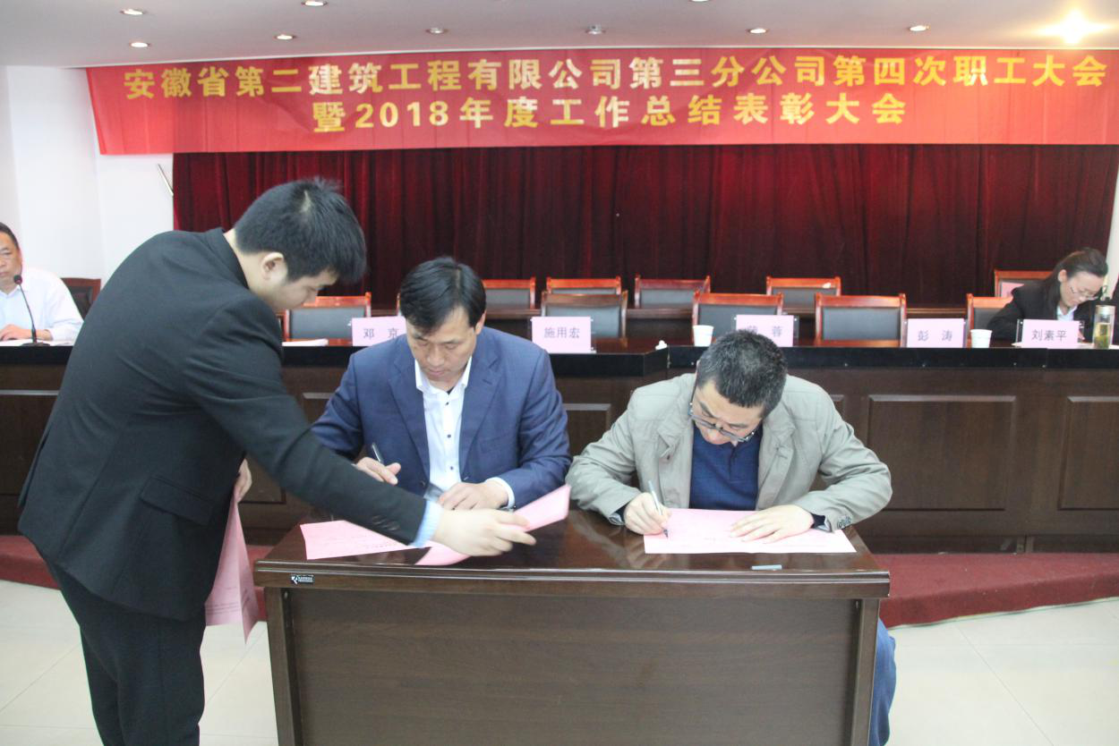 會上,公司黨委工作部對分公司領(lǐng)導(dǎo)班子及班子成員進行民主測評,對后備干部進行民主推薦;馬福才經(jīng)理和各項目經(jīng)理簽訂《目標(biāo)責(zé)任狀》、《勞動競賽責(zé)任狀》,為各責(zé)任主體完成全年指標(biāo)下達了“任務(wù)書”、確立了考核依據(jù);對過去一年在各自崗位上作出突出貢獻的先進科室、項目及個人進行表彰,更好地發(fā)揮了榜樣引領(lǐng)作用,促進形成崇尚先進、學(xué)習(xí)先進、爭當(dāng)先進的良好氛圍。