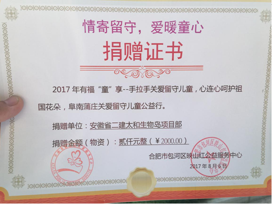 8月6日,由安徽省委政研室、安徽省精神衛(wèi)生防治中心、合肥市映山紅公益服務(wù)中心主辦的“情寄留守,愛暖童心,有福童享”獻(xiàn)愛心公益活動在阜南縣段郢鄉(xiāng)蒲莊村張克樓小學(xué)舉行。安徽二建太和生物島一期項(xiàng)目部項(xiàng)目經(jīng)理任兵代表項(xiàng)目部參加了本次活動。