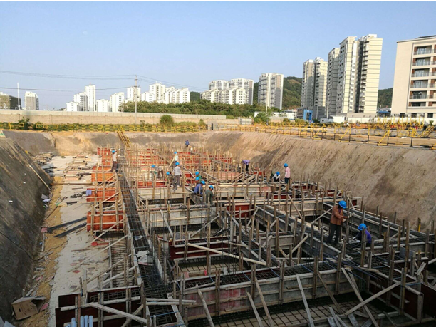 該項目位于宿松縣東北新城將軍山東路,工程包括12棟住宅樓和1座地下車庫,總建筑面積92840.29㎡。其中住宅樓建筑面積69027.76㎡,為框架剪力墻結(jié)構(gòu),住宅樓層高2.9m,建筑高度37.2m;地下車庫總建筑面積14289.53㎡,其中人防地下室建筑面積6996.32㎡,非人防地下室7293.21㎡,為筏板基礎(chǔ)框剪結(jié)構(gòu),地下車庫結(jié)構(gòu)層高3.8m。