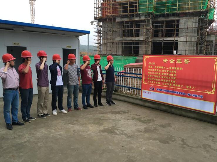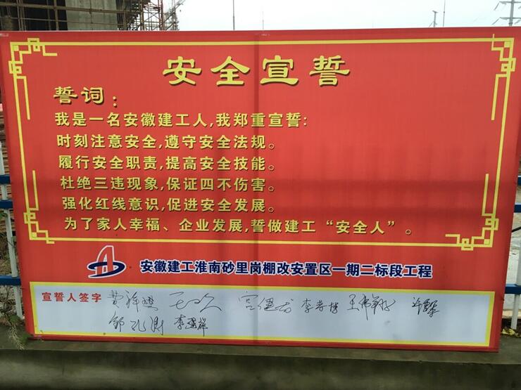 早上六點(diǎn),清晨第一縷陽光剛剛灑下,項(xiàng)目部管理人員已在安全宣誓牌前排列整齊,面對(duì)莊嚴(yán)的宣誓牌,全體成員在項(xiàng)目技術(shù)負(fù)責(zé)人王歡的帶領(lǐng)下,右手握拳置于面龐,鄭重地齊聲宣讀誓詞:我是一名安徽建工人,我鄭重宣誓:時(shí)刻注意安全,遵守安全法規(guī);履行安全職責(zé),提高安全技能;杜絕三違現(xiàn)象,保證四不傷害;強(qiáng)化紅線意識(shí),促進(jìn)安全發(fā)展;為了家人幸福,企業(yè)發(fā)展,誓做建工“安全人”。隨后,項(xiàng)目部全體成員在項(xiàng)目經(jīng)理費(fèi)祥琪的帶領(lǐng)下,陸續(xù)在宣誓牌上簽下了自己的名字,表明自己時(shí)刻謹(jǐn)記安全宣誓內(nèi)容,堅(jiān)持安全生產(chǎn)的決心。